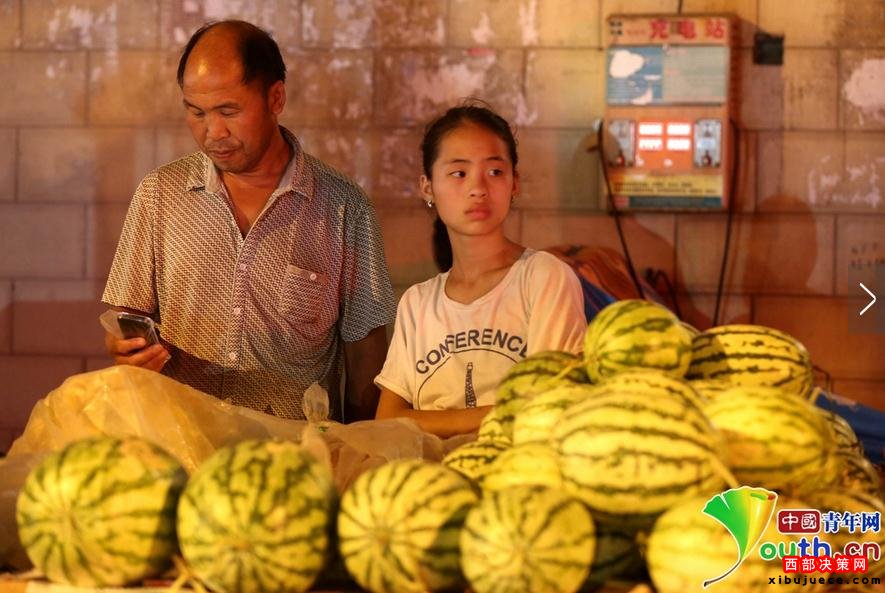2016年7月10日夜晚,在河南省洛陽市老城街頭,宜陽縣高村鄉(xiāng)仟佰嶺村47歲的瓜農(nóng)石勛帶著12歲的女兒賣西瓜。“現(xiàn)在帶女兒賣瓜讓她體驗(yàn)一下瓜農(nóng)的艱辛是為了長大女兒不再賣瓜,我家種了四畝西瓜,從家里到洛陽開拖拉機(jī)要跑六個(gè)小時(shí),賣完西瓜回家趕,每天只能休息三個(gè)小時(shí),女兒去最遠(yuǎn)的地方就是洛陽城,一車西瓜賣完給女兒20塊零花錢,女兒很開心”。石勛說。
