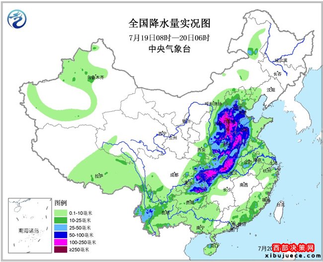 19日,一條強(qiáng)降雨縱貫中東部,山西東部、河北中南部、北京西南部、山東西部、河南北部和南部及湖北中部和西南部、湖南西北部、貴州東北部等地出現(xiàn)大暴雨,河北西南部及河南安陽(yáng)和南陽(yáng)、山西陽(yáng)泉和晉中、湖北荊門、隨州和恩施、貴州銅仁等地部分地區(qū)出現(xiàn)特大暴雨,河北石家莊市平山、井陘和贊皇、邢臺(tái)市臨城和內(nèi)邱、邯鄲涉縣和磁縣、河南安陽(yáng)林州、湖北荊州京山等局地降雨400~616毫米,上述局地1小時(shí)最大降雨100~140毫米。