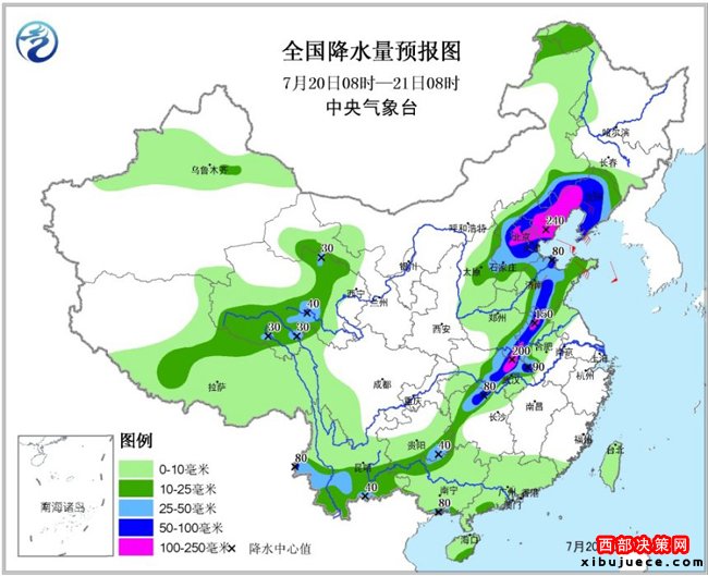 預(yù)計(jì),20日08時(shí)至21日08時(shí),湖南北部、湖北中東部、河南東南部、安徽西北部、江蘇西北部、山東中部、河北中東部、北京、天津、遼寧中南部及云南西部、廣西南部沿海等地有暴雨,其中,河北東北部、遼寧西南部、北京中南部、天津北部以及湖北中部偏北、河南東南部、安徽西北部等地的部分地區(qū)有大暴雨(100~240毫米);上述地區(qū)局地并伴有短時(shí)強(qiáng)降水、雷暴大風(fēng)等強(qiáng)對(duì)流天氣,最大小時(shí)雨強(qiáng)50~70毫米,局地可超過(guò)80毫米。