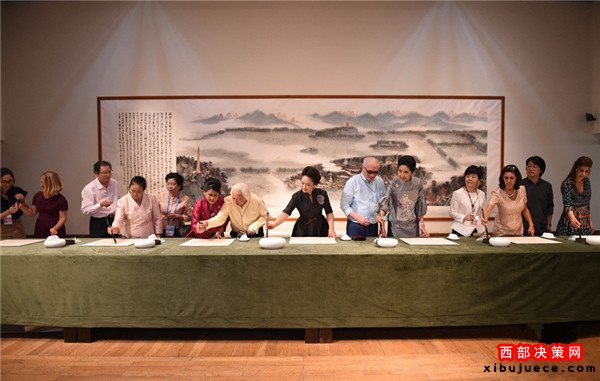 在觀看“意象中國”書畫展時(shí),彭麗媛和來賓們在《西溪紀(jì)勝圖》、《朱荷圖軸》等經(jīng)典國畫作品前駐足觀看,接著欣賞4位著名書畫家現(xiàn)場聯(lián)袂創(chuàng)作書畫作品《江南憶》。一位書法家還為來賓們現(xiàn)場示范毛筆的執(zhí)筆、運(yùn)筆方式。彭麗媛邀請來賓們一同書寫漢字“和”。她說,“和”字在漢語里具有“和平”、“和諧”之義,是我們對世界的共同心愿。來賓們饒有興致地拿起毛筆各自書寫,并展示自己的書法作品。彭麗媛說,昨晚各位在西湖邊觀看了精彩的文藝演出,今天我們在這里一同欣賞畫中的西湖。她同來賓們在國畫《西湖秋勝》前合影留念。