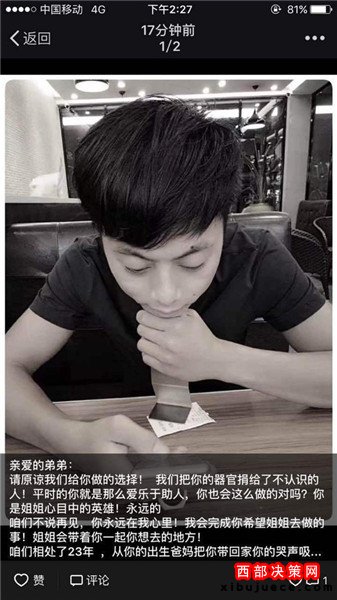 據(jù)了解,22歲的吳遠(yuǎn)旋在東莞鳳崗工作。9月3日凌晨五點,他騎摩托車送友人上班時,不幸發(fā)生車禍,導(dǎo)致重度顱腦外傷,達(dá)到腦死亡狀態(tài)。家屬召開家庭會議后,決定把吳遠(yuǎn)旋所有的重要器官捐獻(xiàn)出來,救助他人。