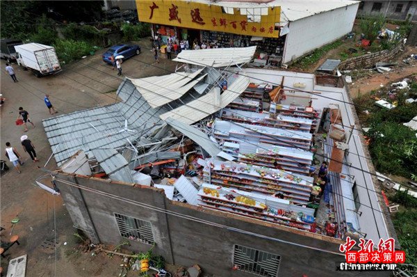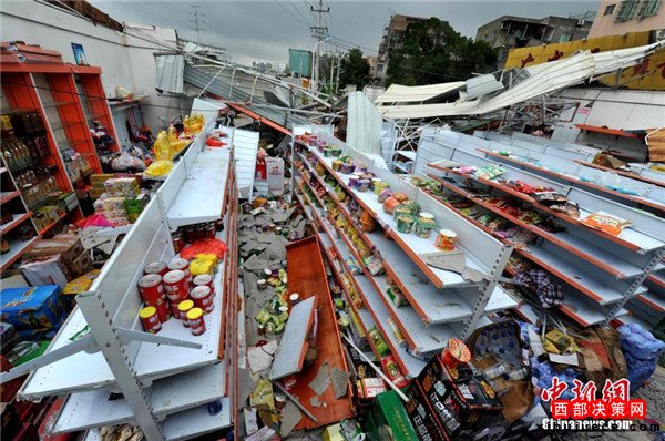 9月15日,今年第14號臺風(fēng)“莫蘭蒂”于凌晨3時05分在廈門翔安區(qū)沿海登陸,登陸時中心附近最大風(fēng)力15級(48米/秒,強臺風(fēng)級),中心氣壓945百帕,給翔安當(dāng)?shù)貛韲?yán)重?fù)p失。圖為翔安一超市被摧毀。