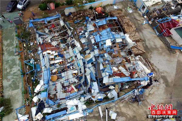9月15日,今年第14號臺風(fēng)“莫蘭蒂”于凌晨3時05分在廈門翔安沿海登陸,登陸時中心附近最大風(fēng)力15級(48米/秒,強臺風(fēng)級),中心氣壓945百帕。圖為航拍登陸點翔安一工地工棚被完全摧毀。
