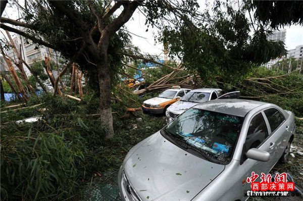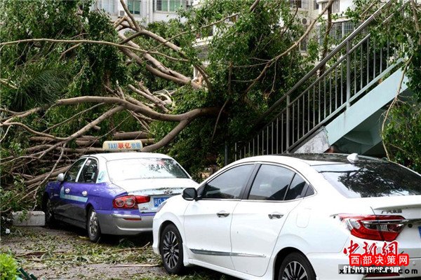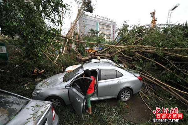 9月15日,今年第14號臺風(fēng)“莫蘭蒂”于凌晨3時05分在廈門翔安沿海登陸,登陸時中心附近最大風(fēng)力15級(48米/秒,強臺風(fēng)級),中心氣壓945百帕。圖為廈門市區(qū)大批車輛被吹倒的樹木損壞。
