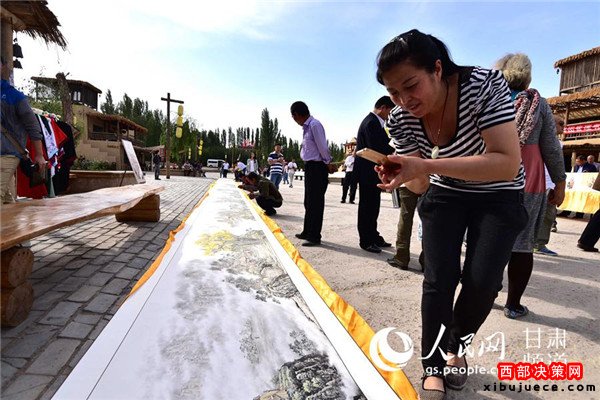 19日上午,在首屆絲綢之路(敦煌)國際文化博覽會召開之際,由敦煌正覺寫經(jīng)院打造的篆刻《道德經(jīng)》百米長卷在敦煌月牙泉小鎮(zhèn)亮相,“獻禮”文博會。