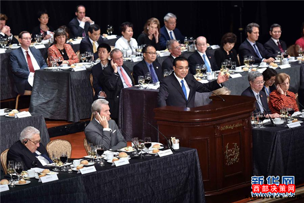 國務院總理李克強當地時間20日晚出席紐約經濟俱樂部、美中關系全國委員會、美中貿易全國委員會聯合舉行的歡迎宴會并致辭和回答提問。