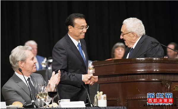 李克強表示,基辛格博士45年前訪華時,中美貿易幾乎為零。45年后的今天,中美貿易額占全世界貿易總量的五分之一,中美經濟總量之和占世界經濟總量的三分之一。我們的貿易和投資量如此之大,自然難免有分歧摩擦,但我們之間的共同利益遠大于誤解和分歧。我們正在進行的雙邊投資協定談判就是向兩國工商界發(fā)出中美進一步擴大相互開放和投資的積極信號。希望美方采取務實靈活態(tài)度,與中方共同努力達成高水平、互利共贏的雙邊投資協定。兩國可以通過更多貿易與人員往來,坦誠溝通,增進理解與互信,推動中美關系朝著穩(wěn)定向好的方向繼續(xù)前行。