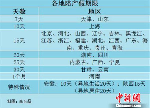 目前,陪產(chǎn)假最短的為天津、山東兩地,為7天;其次是上海,為10天。北京、河北、山西、遼寧、吉林、黑龍江、江蘇、浙江、福建、湖北、江西、廣東、海南、重慶、貴州、青海等省份的陪產(chǎn)假都為15天。