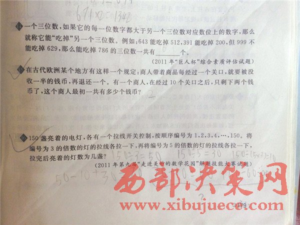 “150盞亮著的電燈,各有一個(gè)拉線開關(guān)控制,被順序編號(hào)為1,2,3,4,…,150。將編號(hào)為3的倍數(shù)的燈的拉線各拉一下,再將編號(hào)為5的倍數(shù)的拉線各拉一下,拉完后亮著的燈數(shù)為幾盞?”這是一道考公因數(shù)和公倍數(shù)的思維數(shù)學(xué)題,今年暑假,才上完三年級(jí)的羅弋在做四年級(jí)的數(shù)學(xué)競賽題集《培優(yōu)新幫手》時(shí)遇到此題,算出答案“90”與標(biāo)準(zhǔn)答案“80”不符,媽媽陳群只當(dāng)兒子錯(cuò)了。