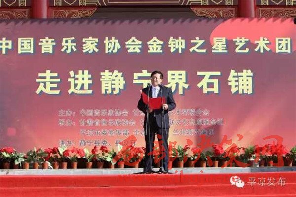 11月3日,在全國(guó)上下認(rèn)真學(xué)習(xí)貫徹黨的十八屆六中全會(huì)精神、隆重紀(jì)念紅軍長(zhǎng)征勝利80周年之際,由中國(guó)音樂(lè)家協(xié)會(huì)、甘肅省文聯(lián)主辦,甘肅省音樂(lè)家協(xié)會(huì)、甘肅省文聯(lián)文藝志愿者服務(wù)團(tuán)、平?jīng)鍪形麄鞑?、平?jīng)鍪形穆?lián)承辦,靜寧縣委、縣政府協(xié)辦的“長(zhǎng)征精神代代傳——中國(guó)音協(xié)金鐘之星藝術(shù)團(tuán)‘送歡樂(lè)·下基層’慰問(wèn)演出活動(dòng)”在靜寧縣界石鋪紅軍長(zhǎng)征毛澤東舊居紀(jì)念館演出。