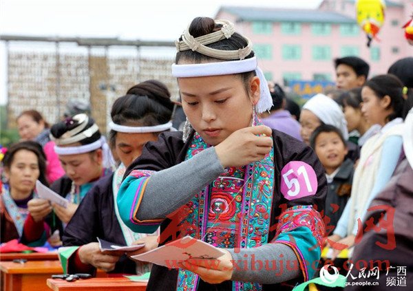 11月12日,在三江侗族自治縣多耶廣場,侗鄉(xiāng)繡娘在進行刺繡比賽。