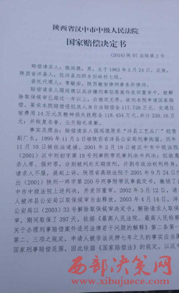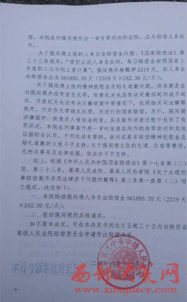 2016年11月9日,陜西省漢中市中級(jí)人民法院作出國(guó)家賠償決定,國(guó)家賠償書(shū)上說(shuō),根據(jù)《中華人民共和國(guó)國(guó)家賠償法》的有關(guān)規(guī)定,決定賠償強(qiáng)闖德561893.70元。(強(qiáng)闖德共被羈押2319天,每天按242.30元賠償)。而對(duì)于強(qiáng)闖德提出的交通、住宿等費(fèi)用,以及精神賠償?shù)纫?,不予支持?/span>
