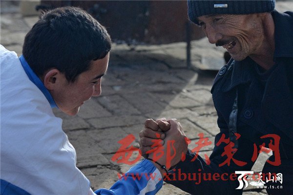 吐?tīng)柡拱鸵掠檬肿呗匪氖辏沟酶觳泊謮延辛?,工人們調(diào)侃父子倆,扳手腕誰(shuí)能贏?