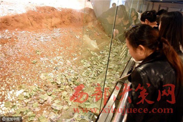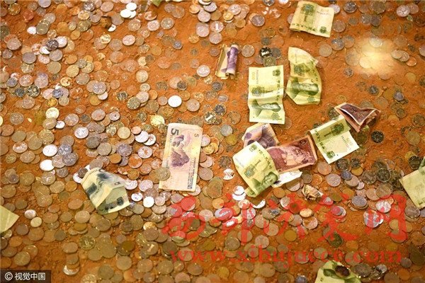 在浙江杭州雷峰塔地宮遺址,不少前來參觀的游客都往遺址內扔錢。