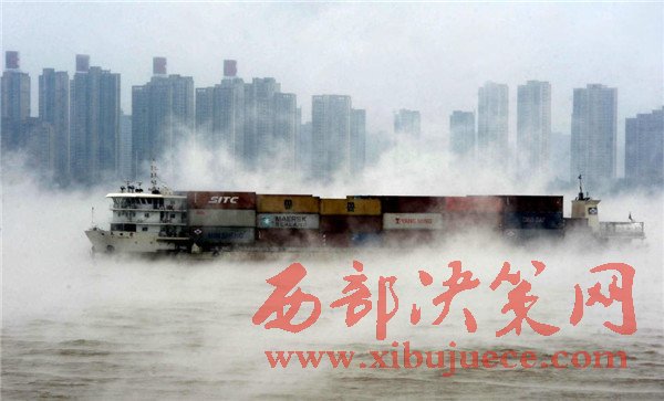 2016年11月23日,湖北武漢,寒潮帶來(lái)極速降溫后,由于江水溫度較大氣溫度高出不少,長(zhǎng)江江面上出現(xiàn)層層水霧,煙波浩渺,蔚為壯觀,放眼望去,仿佛整個(gè)城市都漂浮在云霧之中。