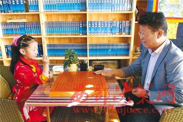 西藏自治區(qū)藏棋協(xié)會秘書長阿旺邊巴正在與孩子下棋。