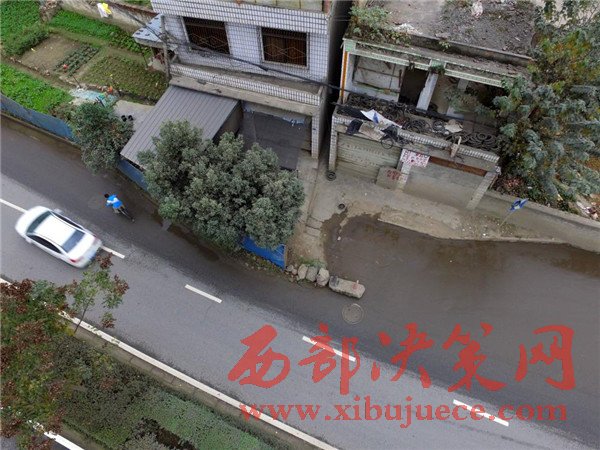這棟房子屋前的院壩、自留地占據(jù)了進(jìn)方向的兩條車道。2008年擴(kuò)建這條路之前,這棟民房就已經(jīng)立在這里,至今已有8年時間。