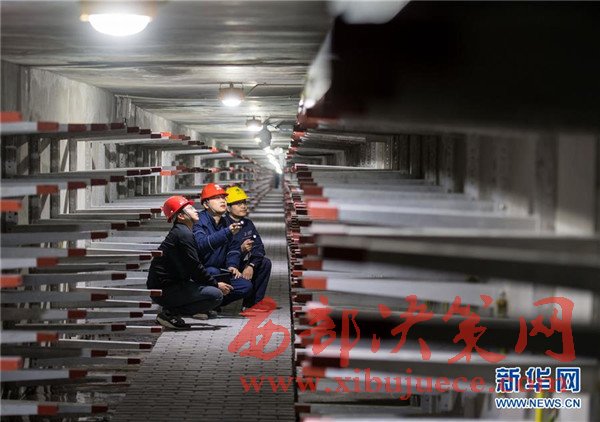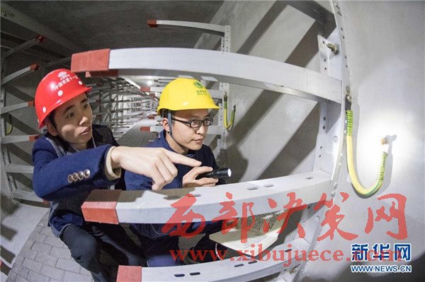 11月24日,解放碑地下環(huán)形電力隧道的一段支線電力隧道內(nèi),兩名國網(wǎng)重慶市區(qū)供電公司的技術(shù)人員(右一、右二)在對預(yù)留的商業(yè)用戶接入隧道的電力設(shè)施設(shè)備進行竣工驗收。當(dāng)日,經(jīng)過3年多的緊張建設(shè),重慶地下環(huán)形“電力高速路”——解放碑地下環(huán)形電力隧道工程順利通過竣工驗收,并正式投入運行。解放碑環(huán)形電力隧道總長2408米,其中1198米的干線電力隧道已經(jīng)成功接入解放碑商圈及周邊地區(qū)的4個110千伏變電站形成環(huán)線,支線電力隧道1210米也開始陸續(xù)接入用戶。據(jù)介紹,作為重慶市重點工程,2013年7月開工建設(shè)的解放碑地下環(huán)形電力隧道按照滿足未來20年電力需求設(shè)計,隧道高2.8米、寬2.4米,投入運行后將解決重慶渝中半島和重慶最繁華的解放碑商業(yè)區(qū)配電設(shè)施老化、無法擴建等問題,使解放碑商圈供電負(fù)荷承載能力得到極大加強。