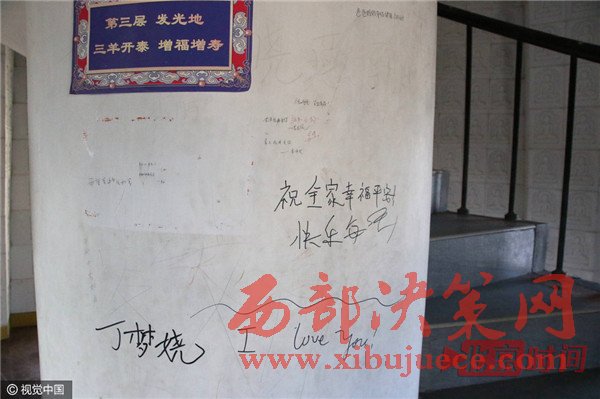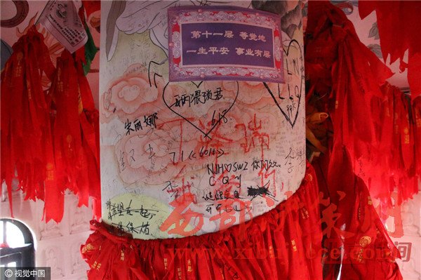 日前,向游客免費(fèi)開放的山東省無棣縣大覺寺海豐塔內(nèi)壁遭到游客涂鴉,幾乎每一層內(nèi)墻壁都被刻滿了情話和祝福語,連墻壁裝飾的佛像圖畫都不能幸免。圖為海豐塔內(nèi)壁遭游客涂鴉,刻滿了情話和祝福語。