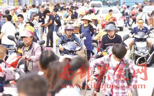 (沒有整治前。進(jìn)入火車站前的道路上,商販的推車構(gòu)成兩條直直的長(zhǎng)線。資料圖)