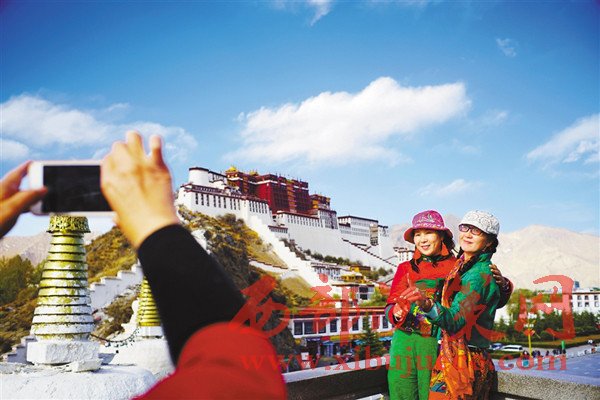 圖為游客在布達(dá)拉宮觀景臺(tái)拍照留念。