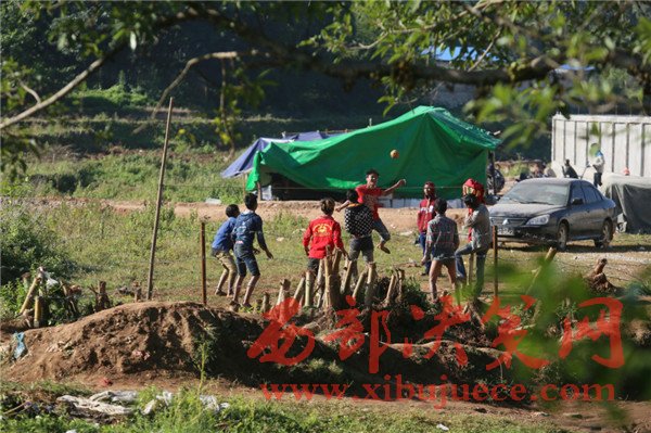 據(jù)邊民張賽亞稱(chēng),20日當(dāng)天早晨7點(diǎn)多,村子里聽(tīng)到槍炮聲,村民們生怕被流彈所傷開(kāi)始逃跑躲避,他家住在畹町河岸,他看到除了橋上騎著摩托車(chē)往中國(guó)的村民,河里還有蹚水的村民成群結(jié)隊(duì),他們也就跟著跑到了中國(guó),家里的牛羊那些現(xiàn)在無(wú)人照看,村里只留有少部分人,他們出來(lái)的不敢回去。在安置點(diǎn)能吃飽睡好,等過(guò)一陣子再回去看看。圖為一群緬甸小孩在岸邊踢足球。