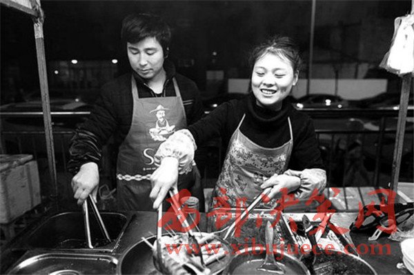 同樣是炒面,河南的楊氏夫婦賣的則是“鐵板炒”,在這個夜市攤干了近4年,每天倆人同出同進,朝夕相處,“有老婆在身邊,干活兒更有動力,做生意也更和諧,更溫情。”