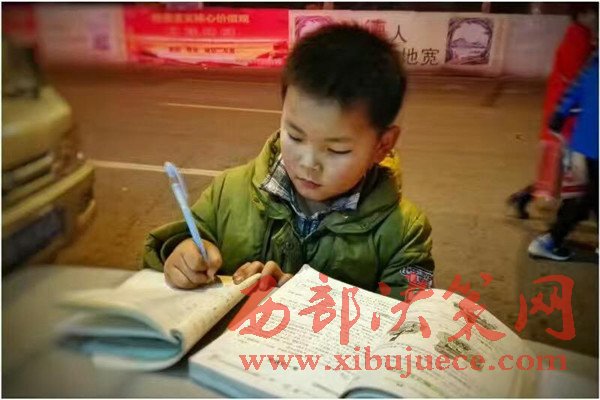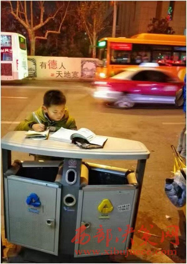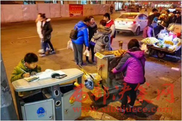 攤位旁,張女士的兒子正趴在垃圾桶上認(rèn)真地寫作業(yè)。這一幕,經(jīng)常會(huì)發(fā)生在青島臺(tái)東大酒店附近。附近許多商販都知道“路邊賣烤地瓜那家”的兒子學(xué)習(xí)很用功,也特別懂事,經(jīng)常幫母親收拾貨物,照看攤位。