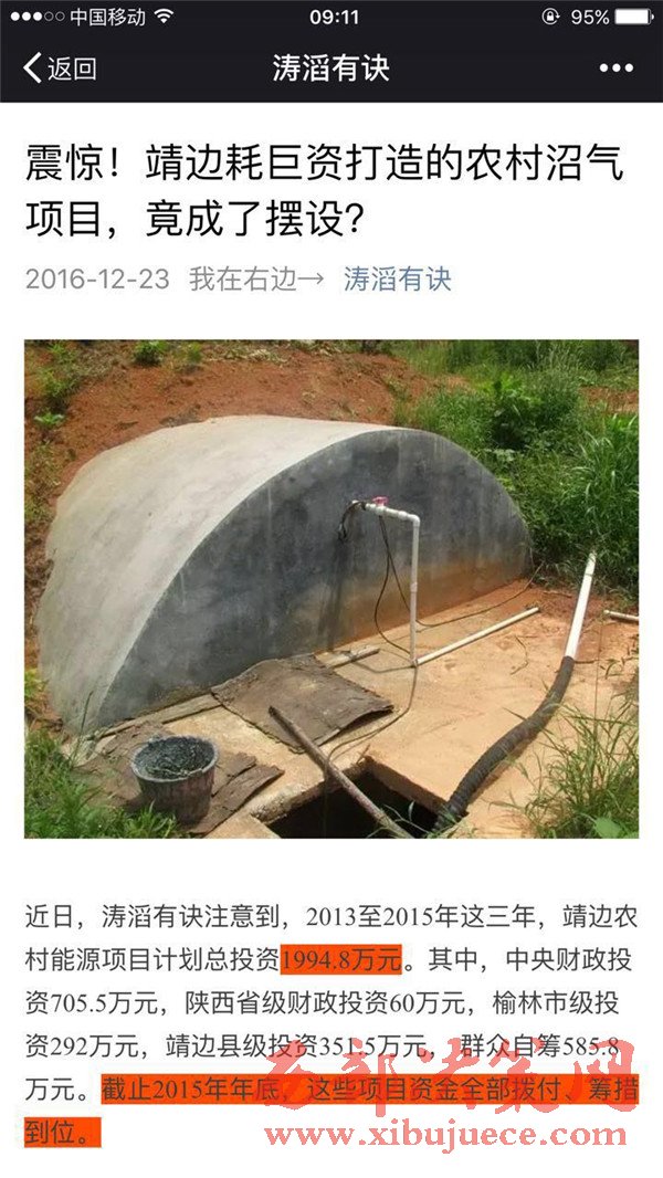 雖然靖邊縣審計局的審計報告,語言高度凝練,也沒給出相應(yīng)的案例和圖片證明,但很顯然,近三年以來,靖邊縣能源辦手持巨額撥款,全力推進(jìn)的農(nóng)村沼氣工程,在今年春天就變成了“利用率低、廢棄率高”的擺設(shè)。如果是這樣的話,投入再多的財力人力,又有什么意義呢?