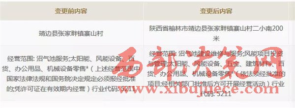 蹊蹺的是,一年半之后的2015年3月18日,靖邊興發(fā)公司突然變更了業(yè)務(wù)范圍。將原來的"沼氣池服務(wù)”,增加了四個關(guān)鍵字“建設(shè)維修”,最終變更成了“沼氣池建設(shè)維修與服務(wù)”。