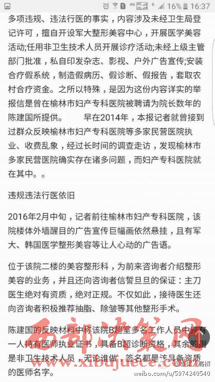 2016年7月6日市場信息報報道:榆林婦產(chǎn)醫(yī)院違法行醫(yī)未經(jīng)衛(wèi)生局登記許可擅自開設(shè)軍大整形美容中心制造假病歷、假診斷、假報告套取農(nóng)村合療資金。