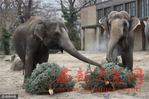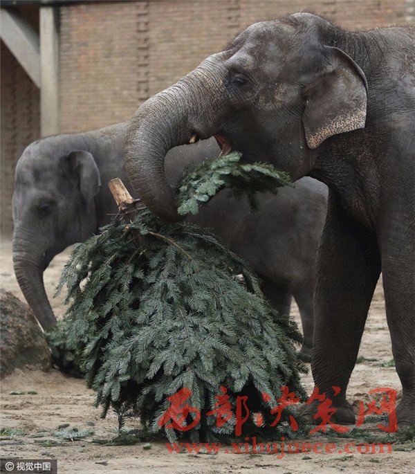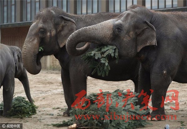當(dāng)?shù)貢r(shí)間2017年1月3日,德國(guó)柏林,Zoologischer Garten動(dòng)物園的大象們食用“圣誕樹(shù)”美食大餐。