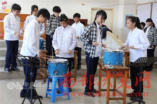 社團音樂老師趙純瓏說,打擊樂團有16名成員,原本是豎笛社團,但發(fā)現(xiàn)孩子們經(jīng)常隨著節(jié)奏拍打大腿或拍桌,非?;顫娪志咭魳诽旆郑赃@學(xué)期才成立打擊樂團。