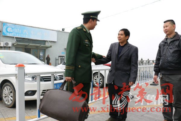 1月9日,周開(kāi)樹(shù)在南黃邊防派出所為母親開(kāi)具無(wú)戶(hù)籍證明后,然后帶母親來(lái)到青島,當(dāng)天下午坐上了青島至成都的火車(chē),坐在火車(chē)上,周開(kāi)樹(shù)的眼前又浮現(xiàn)出當(dāng)年的情景,一個(gè)11歲的少年,緊緊拉著母親的手:“媽媽?zhuān)鷦e走,長(zhǎng)大后我養(yǎng)活您……”圖為周開(kāi)樹(shù)與南黃邊防派出所民警見(jiàn)面。