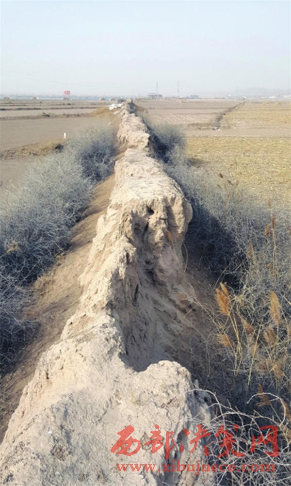 省政府立的明長城景泰段全國重點(diǎn)文物保護(hù)碑。 本文圖均為 甘肅日報(bào) 圖春節(jié)期間,記者來到這段明長城后看到,這段由黃土夯筑而成的長城,在歷經(jīng)400多年的風(fēng)雨侵蝕和人為破壞后,已成為斷斷續(xù)續(xù)、高低不一的“土壟子”。即便間或殘存有一大段連續(xù)的城墻,也被兩側(cè)的農(nóng)田“啃噬”得只剩下一兩米高寬。
