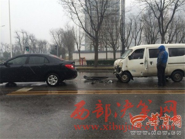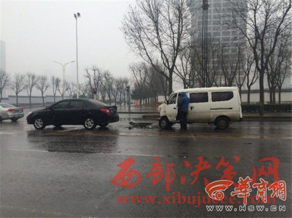 西安降雪,緩解了霧霾天氣,不過雪天路滑,給司機(jī)行車帶來不少麻煩。昨日下午2時50分許,在西安市雁翔路一處丁字路口,一輛白色面包車因紅燈剎車不及,撞上了前面停車等紅燈的一輛黑色私家車,造成車頭損毀,所幸兩車司機(jī)均未受傷。提醒司機(jī)朋友,雨雪天氣路面濕滑,請謹(jǐn)慎行駛,注意保持安全車距,以免發(fā)生意外。