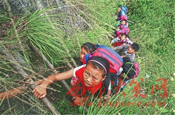 曾經(jīng),孩子們背著沉甸甸的書包,每天爬藤梯上下學(xué)。