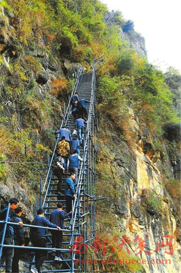 鋼梯,是從去年8月開始啟動(dòng)修建的,州、縣兩級(jí)財(cái)政共投入了100萬元。11月,鋼梯完工投入使用。莫色子古說,這些鋼管牢牢焊入懸崖,一共組成21段、767級(jí)臺(tái)階。整個(gè)鋼梯用了大約1500根、40多噸鋼管,光是固定用的扣件,就用了6000多個(gè)。
