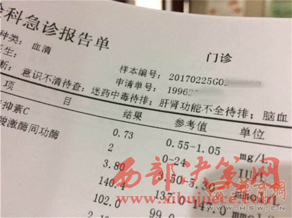 小美的檢查報(bào)告顯示,醫(yī)院方面臨床診斷為,意識不清待查、迷藥中毒待排、肝腎功能不全待排等。