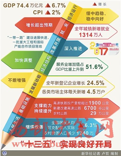 經(jīng)濟(jì)運(yùn)行緩中趨穩(wěn)、穩(wěn)中向好。國(guó)內(nèi)生產(chǎn)總值達(dá)到74.4萬(wàn)億元,增長(zhǎng)6.7%,名列世界前茅,對(duì)全球經(jīng)濟(jì)增長(zhǎng)的貢獻(xiàn)率超過(guò)30%。居民消費(fèi)價(jià)格上漲2%。工業(yè)企業(yè)利潤(rùn)由上年下降2.3%轉(zhuǎn)為增長(zhǎng)8.5%,單位國(guó)內(nèi)生產(chǎn)總值能耗下降5%,經(jīng)濟(jì)發(fā)展的質(zhì)量和效益明顯提高。