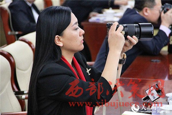 兩會上的女記者聚精會神拍攝現(xiàn)場照片。