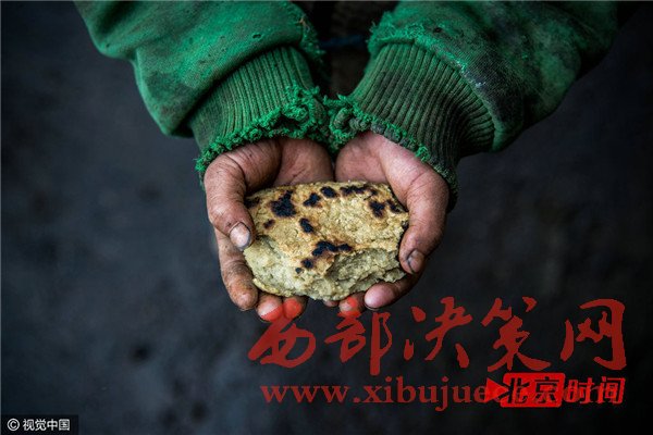 我看到孩子啃這塊玉米面餅的時(shí)候,應(yīng)該已經(jīng)放了好幾天了。我用手掰了一下,沒有成功,卻沾了一手的灰土。