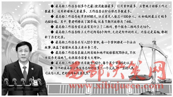 今年的最高檢工作報(bào)告,雖然篇幅比去年短約500字,卻創(chuàng)造了多個(gè)史上之最——使用數(shù)據(jù)最多、引用案例最多、點(diǎn)贊地方檢察工作次數(shù)最多、運(yùn)用新媒體元素最多、工作報(bào)告出爐后修改條數(shù)最多。