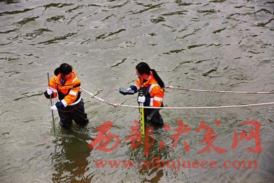 雨后河水流比較大,她們身穿防汛服綁著安全繩在河道里作業(yè)