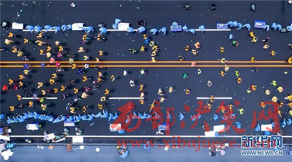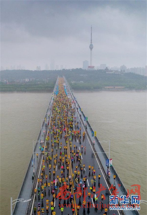 當(dāng)日,2017武漢馬拉松在雨中鳴槍開跑。武漢馬拉松因穿越漢江、長(zhǎng)江、東湖,橫跨包括武漢長(zhǎng)江大橋在內(nèi)的多座橋梁而備受馬拉松愛好者追捧。