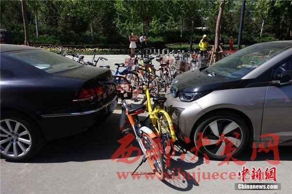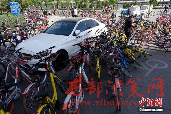 一輛私家車被各家公司、不同顏色的“共享單車”層層包圍。