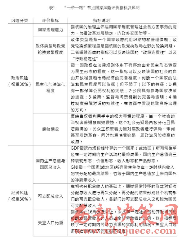 “一帶一路”建設(shè)中重要國(guó)家的治理風(fēng)險(xiǎn)是我們的主要關(guān)注對(duì)象,在借助國(guó)內(nèi)外智庫(kù)和科研院所已完成的眾多研究成果的基礎(chǔ)上,建立一套對(duì)節(jié)點(diǎn)國(guó)家風(fēng)險(xiǎn)的評(píng)級(jí)體系,如表1(見P28)所示。節(jié)點(diǎn)國(guó)家風(fēng)險(xiǎn)評(píng)價(jià)指標(biāo)中,政治風(fēng)險(xiǎn)與經(jīng)濟(jì)風(fēng)險(xiǎn)的評(píng)價(jià)參考經(jīng)濟(jì)學(xué)人智庫(kù)的國(guó)家風(fēng)險(xiǎn)模型(EIU country risk model);公共衛(wèi)生風(fēng)險(xiǎn)的評(píng)價(jià)參考中國(guó)衛(wèi)生與經(jīng)濟(jì)社會(huì)發(fā)展統(tǒng)計(jì)數(shù)據(jù)庫(kù)對(duì)公共衛(wèi)生的指標(biāo)設(shè)計(jì);國(guó)際沖突風(fēng)險(xiǎn)評(píng)價(jià)根據(jù)經(jīng)濟(jì)學(xué)人智庫(kù)發(fā)布的白皮書《愿景與挑戰(zhàn)——“一帶一路”沿線國(guó)家風(fēng)險(xiǎn)評(píng)估》與中國(guó)出口信用保險(xiǎn)公司發(fā)布的2015年版《國(guó)家風(fēng)險(xiǎn)分析報(bào)告》和《全球風(fēng)險(xiǎn)地圖》綜合考量得出。具體而言,我們可以從“政治風(fēng)險(xiǎn)”“經(jīng)濟(jì)風(fēng)險(xiǎn)”“公共衛(wèi)生風(fēng)險(xiǎn)”和“國(guó)際沖突風(fēng)險(xiǎn)”四個(gè)維度來評(píng)估選擇出的節(jié)點(diǎn)國(guó)家的風(fēng)險(xiǎn),如表2(見P30)所示。