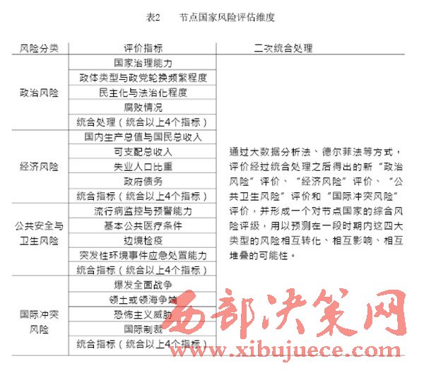 就目前階段而言,我們認(rèn)為應(yīng)當(dāng)加入兩個(gè)綜合評(píng)價(jià)指標(biāo)來統(tǒng)合“政治風(fēng)險(xiǎn)”“經(jīng)濟(jì)風(fēng)險(xiǎn)”“公共衛(wèi)生風(fēng)險(xiǎn)”和“國(guó)際沖突風(fēng)險(xiǎn)”。第一個(gè)綜合指標(biāo)用以統(tǒng)合4個(gè)二級(jí)指標(biāo),反映同一類型的風(fēng)險(xiǎn)相互轉(zhuǎn)化、相互疊加或相互影響的程度;第二個(gè)綜合指標(biāo)用以統(tǒng)合4個(gè)一級(jí)指標(biāo),反映不同類型的風(fēng)險(xiǎn)相互轉(zhuǎn)化、相互干擾或相互堆扎的程度。
