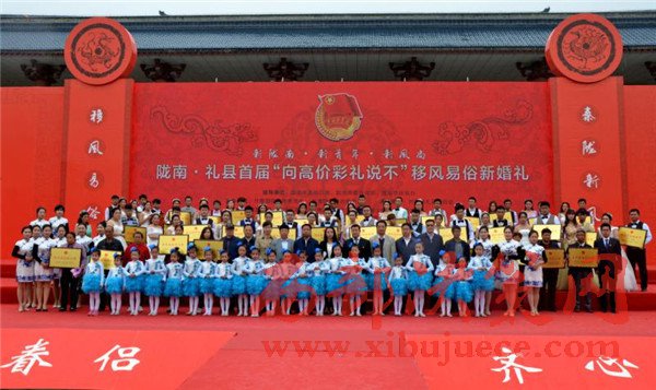 5月7日,甘肅隴南禮縣秦文化廣場(chǎng)上人潮如海,喜氣洋洋。倍受社會(huì)關(guān)注的隴南市首屆“向高價(jià)彩禮說(shuō)不”移風(fēng)易俗新婚禮在這里隆重舉行。來(lái)自禮縣各鄉(xiāng)鎮(zhèn)精準(zhǔn)扶貧戶中的30對(duì)新人以隆重儉樸的新婚儀式喜結(jié)連理,見(jiàn)證了彼此的愛(ài)情。