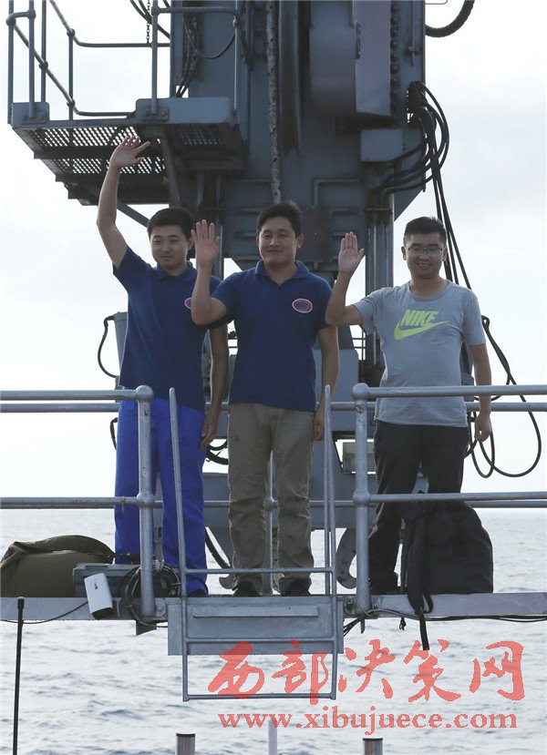 5月10日,科學家鹿博、主駕駛員齊海濱(中)和副駕駛員陳云賽(右)下潛歸來。